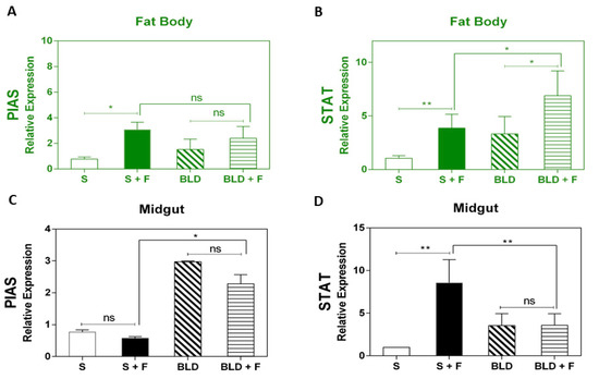 We then investigated the level of activation of the JAK-STAT pathway after infection in both sugar- and blood-fed mosquitoes. Expression analysis showed that STAT was upregulated in the fat body of fungus-infected mosquitoes regardless of the diet (Figure 4B). In the midgut, only sugar-fed mosquitoes showed STAT upregulation after fungal infection (Figure 4D). The negative modulator PIAS was significantly upregulated after infection in the fat body of sugar-fed mosquitoes. In fungus-infected blood-fed mosquitoes, PIAS did not differ from control uninfected blood-fed, but its expression was elevated in both and not significantly different from that of sugar-fed (Figure 4A). In the midgut, only blood-fed mosquitoes presented increased expression of PIAS regardless of infection.
