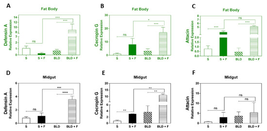 In the midgut, cecropin G was up-regulated regardless of diet following fungal infection, but its expression was more pronounced in the fungus-infected blood-fed mosquitoes (Figure 5D). Defensin A was only up-regulated in the fungus-infected blood-fed mosquitoes, while attacin showed no significant upregulation for either diet in tissues from infected mosquitoes (Figure 5E), even though these genes tend toward an increase in their expression.