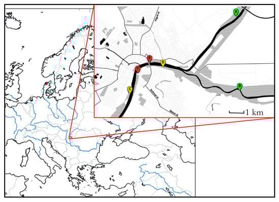 Our study site was in and around the city of Szeged (46°15′ N; 20°8′ E), 170 km southeast of Budapest (Hungary). This city lies on both sides of the lower reaches of the Tisza River. Upstream but within the city limits, it also receives the Maros River: both of them collect water from the Carpathians, and regularly flood their forested floodbeds (although no flood was registered during the period of study) (Table A1). The floodbed was transformed during the end of the 19th century so, that the drainage of the water is optimal and the flood effect reducing infrastructure, built in 1973, is far enough upstream (150 km) from the city to assume equal flood intensity across the urban gradient []. The riverside forests are nearly continuous on the left bank, and more fragmented on the right one, allowing us to choose an urbanization gradient fulfilling the Globenet protocol conditions [] (Figure 1).