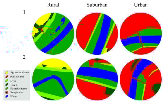 Data were collected during the growing seasons (April–October) in 2014–2016. Selected locations on both banks included rural, suburban, and urban areas, with an increase in the built-up area, increasing intensity of forest management, as well as visitation rates by city residents from rural to urban habitats (Figure 2). The average built up area (within a 500 m radius of a study site) was 0.3% in rural, 41.3% in suburban, and 54.8% in urban sites (Figure 2). In rural areas, cultivated fields dominated outside the dykes (12.5%) (Figure 2). In the riverside forest, the undergrowth was not managed in the rural sites, while in the urban sites the undergrowth was cut twice yearly. In the suburban areas, the last such operation was 2 years before the start of the study.