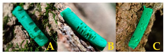 Along the two urbanization gradients, the average distance between sites was 5 km (range: 1–10 km). In each site, there were four patches with a minimum distance of 10 m between them. Within each patch, 12 trees were selected pseudo randomly by considering the species and trunk diameter. The average distance of selected trees within patches were 4.4 m (range: 0.5–23 m). On each of these, one dummy caterpillar was placed on the trunk and one at a random distance (range: 0–4 m) and direction from the base of the tree, on the ground. The dummy caterpillars (20 mm long, 3 mm thick) were made of light green plasticine (Smeedi plus, V. nr. 776609, Vilborg, Denmark), using a modified garlic press []. The colour, shape, and size imitated a general caterpillar prey []. The artificial prey was fixed to the bark of the trees or on a suitable surface on the ground with superglue (Pentack Super Glue, Pentacolor, Budapest, Hungary), and exposed for 24 h, then checked for attack marks using a handheld magnifying glass (10 ×). In case of doubt, the caterpillar was photographed and inspected on computer. Predators were identified by their characteristic marks left on the artificial prey (Figure 3). Attacks by different predators were considered independent events, but multiple marks by the same type of predator were classified as single attack. Overall, 12,672 caterpillars were exposed during the three years; 448 of them were not recovered.