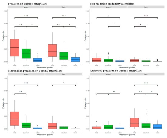There was a generally decreasing trend along the urbanization gradient (Figure 4). We found no significant differences in attack rates at ground level (rural–suburban: Estimate = −0.003, SD = 0.013, z = −0.241, p = 0.090, rural–urban: Estimate = 0.031, SD = 0.013, z = 2.342, p = 0.050, suburban–urban: Estimate = 0.028, SD = 0.013, z = 2.101, p = 0.969), but trunk-placed caterpillars in the rural habitat suffered significantly higher attack rates than those in the suburban or urban habitats (rural–suburban: Estimate = −0.014, SD = 0.006, z = −2.377, p = 0.046, rural–urban: Estimate = 0.022, SD = 0.006, z = 3.648, p < 0.001, suburban–urban: Estimate = 0.008, SD = 0.006, z = 1.271, p = 0.412) (Figure 4).