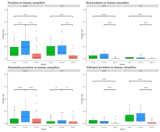 Autumn predation levels were significantly lower than during spring or summer at both trunk (spring–summer: Estimate = −0.006, SD = 0.004, z = −1.620, p = 0.237, spring–autumn: Estimate = −0.020, SD = 0.004, z = −5.688, p < 0.001, summer–autumn: Estimate = −0.014, SD = 0.004, z = −3.942, p < 0.001) and ground level (spring–summer: Estimate = 0.006, SD = 0.008, z = 0.823, p = 0.689, spring–autumn: Estimate = −0.039, SD = 0.008, z = −5.007, p < 0.001, summer–autumn: Estimate = −0.045, SD = 0.008, z = −5.649, p < 0.001) (Figure 5).