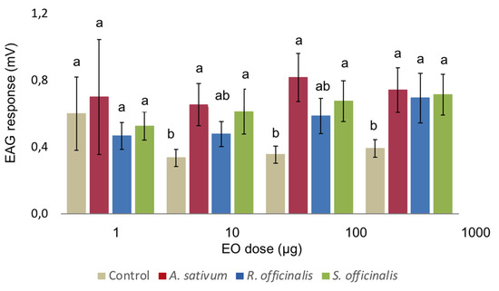 Mean Electroantennography responses of female C. vomitoria to puff test using 1 µL of ethanol solution containing different concentrations of Allium sativum, Rosmarinus officinalis, and Salvia officinalis essential oils. Bars indicate standard error. Values labelled with different letters are significantly different by an LSD test (p ≤ 0.05).