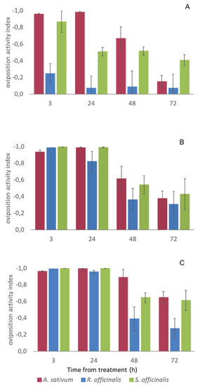 Overall, the ANCOVA showed a significant difference among the oviposition deterrence of the three EOs after controlling for the effects of the EO concentration and time of exposure (F2, 139 = 10.688, p < 0.001, ηp2 = 0.133). In detail, Bonferroni post-hoc tests of the OAI EM means indicated no significant differences between A. sativum and S. officinalis EOs (OAI EM means = −0.574 ± 0.037, and −0.534 ± 0.037, respectively, p = 1.000) and that the two were significantly more effective than the R. officinalis one (OAI EM mean = −0.349 ± 0.037, p = 0.002) (Table 2).