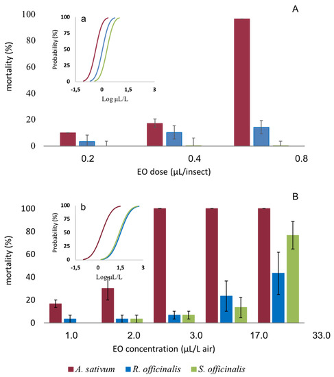 Mean mortality of Calliphora vomitoria adults exposed by topical application (A) and fumigation (B) to Allium sativum, Rosmarinus officinalis, and Salvia officinalis essential oils. Bars represent the standard error. Embedded graphics show the probability of mortality of the insects exposed to the EOs by topical application (a) and by fumigation (b) calculated by Log-Probit regression.