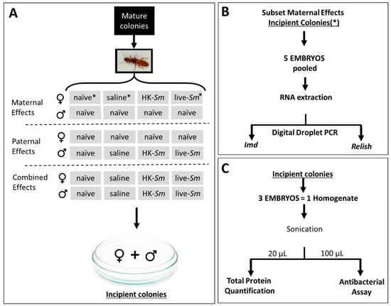 Figure 1. Experimental scheme and protocols. (A) Virgin alates were collected from mature colonies, de-winged, and weighed. Parental effects (either maternal, paternal, or combined maternal and paternal) following Serratia exposure were tested by treating de-winged reproductives with one of three injections—saline, heat-killed Serratia (HK-Sm), or live Serratia (live-Sm)—or leaving the reproductives untreated (naïve). These individuals were then paired with mates to form incipient colonies. Pairs were set up in Petri dishes with 2.5 mg of white birch wood and dampened Whatman #1 filter paper. (B) In a subset of the maternally treated colonies (where naïve, saline, and Live-Sm queens were paired with naïve kings, indicated with the symbol * in A), five embryos (two days old) per colony were pooled into a single sample and subsequently used in RNA extraction and Digital Droplet PCR to quantify two immune-related genes. (C) Following the onset of oviposition, two-day-old embryos resulting from all pairings in (A) were collected. Three embryos per incipient colony were pooled into a single homogenized sample. This pooled sample was divided in two aliquots, one to quantify protein content and the second to test that sample’s antibacterial properties. Sample sizes for (A–C) are given in Table 1.