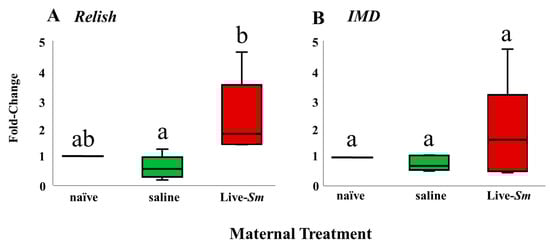 Figure 2. Fold transcript abundance differences of two immune-related loci, Relish (a) and IMD (b), as a function of maternal treatment; n = 5 samples consisting of five pooled embryos. Bars (±SEM) represent gene dysregulation relative to “naïve” samples (which were normalized to 1). Different letters denote statistical significance across pairwise comparisons for all three treatments.