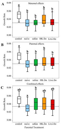 Figure 3. Median growth rates (GR) of Arthrobacter cultured with and without embryonic homogenates from (A) maternal effects, (B) paternal Effects, and (C) combined effects. Letters indicate statistical significance (Supplementary Table S3). Dashed lines indicate the median growth rate of Arthrobacter grown in the presence of embryo homogenates across the four parental treatments for each graph.