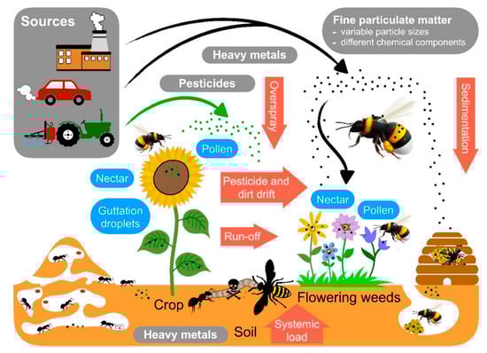 Notwithstanding the worldwide dramatic decline in the abundance and species richness of insects [1,2,3], massive losses in honey bee colonies and the potential decline in wild bees as pollinators have caught the attention of scientists and the public alike [6,55,56,57,58]. Environmental pollution is regarded as one of the major drivers of (social) insect decline. Among the pollutants, pesticides used in agriculture have gained the most attention because pollinators visit crop plants or wild flowers growing near arable fields and are confronted with those chemicals when collecting food (Figure 1) [59,60,61,62]. Heavy metals are a second group of pollutants that may threaten social insects in agricultural regions, but also in more urbanized or industrial areas [31,35,63,64,65,66,67,68,69,70,71]. Heavy metals are present in soils (either naturally or due to pollution) and can potentially lead to contamination of the nests of social insects, or they may move up the food chain (Figure 2). Plants may take up heavy metals which, in turn, are ingested by social bees collecting pollen and nectar. Also, other herbivorous insects serving as prey for social wasps may accumulate these pollutants, which may result in the increased exposure of these predatory wasps to heavy metals [35,36,47,63,65,68,69,70,71,72,73,74,75,76,77,78,79,80]. Pesticides (or their residues) and heavy metals, as well as other pollutants from combustion, traffic, agriculture, and coal mining, can also form or bind to fine particulate matter [66,81,82,83,84,85,86,87,88,89,90,91] that pollutes the air. Eventually, fine particulate matter settles on surfaces, such as insect cuticles [88,89] or flowers [92] (Figure 2). From there, social bees might collect these particles, together with nectar or pollen. Fine particulate matter is defined by the size of particles, rather than the specific substance class of which it is composed [93,94,95]. It may be composed of different chemical components, such as ammonium, silicon, sulfate, nitrate, elemental carbon matter, organic carbon matter, sodium, heavy metals, or phenolic compounds [93,96]. This is unfortunate, because we think that the detrimental effects on social insect health is likely to be mediated by both, i.e., small particles and their chemical properties [97,98]. Particle size potentially determines whether particles can enter tissues, whereas the chemical properties potentially define the degree of toxicity or reactivity with tissue.