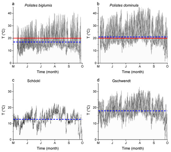 - Kovac, H.; Käfer, H.; Petrocelli, I.; Stabentheiner, A. Comparison of thermal traits of Polistes dominula and Polistes gallicus, two European paper wasps with strongly differing distribution ranges. J. Comp. Physiol. B 2017, 187, 277–290. [Google Scholar] [CrossRef]