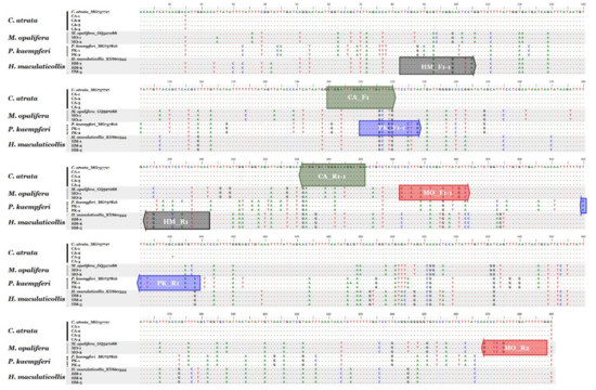 To avoid errors arising from sampling bias, the four following sequences were included for SCAR marker development: C. atrata, MG737717; M. opalifera, GQ527088; P. kaempferi, MG737816; and H. maculaticollis, KY860344. A total of 15 nucleotide sequences were aligned using ClustalW and edited using BioEdit [38]. On the basis of the aligned sequences, we searched several short regions (19–23 bp) that contained at least two species-specific nucleotides, and tried to design primers to include species-specific nucleotides close to the 3’ end. PCRs were performed to investigate the effectiveness of each primer combination, and the best primer set generating consistent results was selected. Amplification was conducted in a 20 µL PCR mixture containing 0.5 μmol L−1 of each species-specific forward and reverse primer (Table 2), Solg 2 × Taq PCR Smart Premix 1 (Solgent), and approximately 15 ng template DNA using the Pro Flex PCR System (Applied Biosystems, Life Technologies). The following thermal cycling conditions were used: 95 °C for 2 min; 35 cycles of 20 s at 95 °C, 30 s at 55 °C, and 20 s at 72 °C; and a final extension for 5 min at 72 °C. PCR products were visualized by gel electrophoresis on 1.5% agarose gel, as described in Section 2.2.