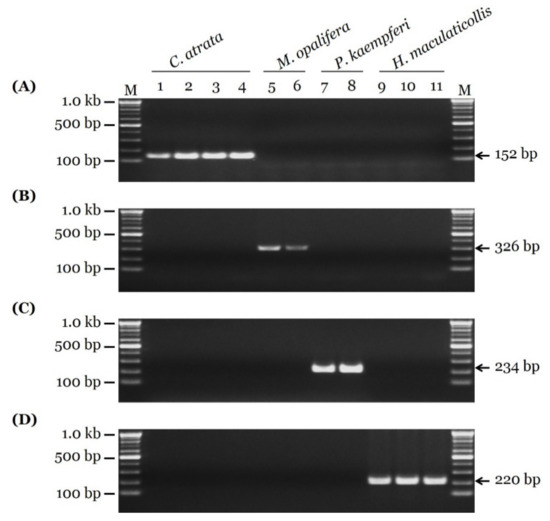 Gel images showing species-specific SCAR PCR results. Fragments of COI regions of (A) C. atrata, (B) M. opalifera, (C) P. kaempferi, and (D) H. maculaticollis were produced using CA_F1/CA_R1-1, MO_F1-1/MO_R2, PK_F1-1/PK_R1, and HM_F1-1/HM_R1 primer pairs, respectively. Primer sequences listed in Table 2. Lanes 1 to 4 correspond to Samples CA-1 to CA-4, respectively, of C. atrata; Lanes 5 and 6 correspond to Samples MO-1 and MO-2, respectively, of M. opalifera; Lanes 7 and 8 correspond to Samples PK-1 and PK-2, respectively, of P. kaempferi; Lanes 9 to 11 correspond to Samples HM-1 to HM-3, respectively, of H. maculaticollis. Information of 11 samples provided in Table 1. Lane M represents 100 bp DNA ladder. Arrows indicate precise sizes of PCR products.