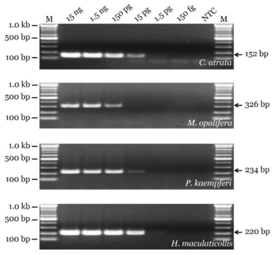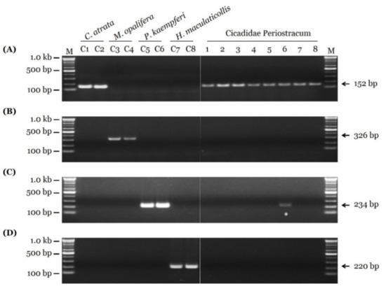 From the 11 cicada samples, 690 bp of COI sequences were obtained. In addition, four sequences from the GenBank database were included, for a total of 15 sequences. On the basis of comparative sequence analysis of the COI sequences, nucleotide polymorphisms for species identification were detected (Figure 1). On the basis of these nucleotide polymorphisms, species-specific primer pairs were developed and optimized (Figure 1 and Table 2). These primer pairs produced PCR products of 152, 326, 234, and 220 bp for C. atrata, M. opalifera, P. kaempferi, and H. maculaticollis, respectively (Figure 2). PCR product sizes were proven to be unique and discriminable by comparing the bands on agarose gel (Figure S3).