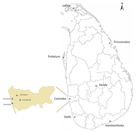 We obtained collections from 10 sites in Sri Lanka, including four collections from various locations within Colombo (B, D, N and J) and single collections from Jaffna, Galle, Hambanthota, Puttalum, Trincomalee and Kandy (Figure 1; Supplementary Tables S1 and S2). Colombo, the commercial capital of Sri Lanka, is the largest city in the country, with the highest population density. The Port of Colombo (Figure 1) ranks among the top 35 ports in the world and has one of the biggest artificial harbors []. It is an important terminal in Asia due to its strategic location in the Indian Ocean. It is a major international container trans-shipment hub, handling most of the country’s foreign trade. Hambantota (Figure 1) is a harbor close to international shipping routes on the southern tip of Sri Lanka [], which has been opened recently in 2010 to provide facilities for port-related industries and services not provided by Colombo. Trincomalee (Figure 1) is a natural deep-water harbor in northeast Sri Lanka and is the second-largest natural harbor in the world []. It is accessible to all types of vessels in all weather conditions. It is approximately 10 times larger than the Port of Colombo. Galle (Figure 1) is the capital city, a regional port and a popular tourist attraction in southern Sri Lanka. It is a World Heritage Site and may be involved in the movement of mosquitoes and DENVs since many tourists visiting Colombo take the train or a bus to Galle. Aedes aegypti were also collected in three inland sites. Jaffna (Figure 1) is the capital city of the Northern Province of Sri Lanka. Prior to the civil war, it was Sri Lanka’s second most populated city (the first being Colombo). Since the end of the war in 2009, refugees and internally displaced people have returned to their homes and government and private sector reconstruction has begun. This immigration may contribute to the movement of mosquitoes and DENVs. Kandy is a well-known tourist attraction site as well (Figure 1). Puttalam (Figure 1) is an industrial center known for energy production, salt, coconut production and fishing.