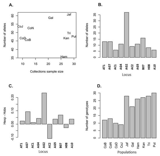 There was no obvious correlation between sample sizes and the numbers of alleles detected in a collection (Figure 2A). The number of alleles detected per locus varied between five for loci AC1 and A10 to 36 for locus AG2 (Figure 2B). Heterozygosity expected (He) exceeded the observed heterozygosity (Ho) in eight of the 10 loci (Figure 2C). The greatest excess in He was observed in locus AG2 that also had the largest number of alleles. Null alleles were frequent at locus AC5 and it was therefore excluded from further analysis. Linkage disequilibrium was not detected among the loci studied.