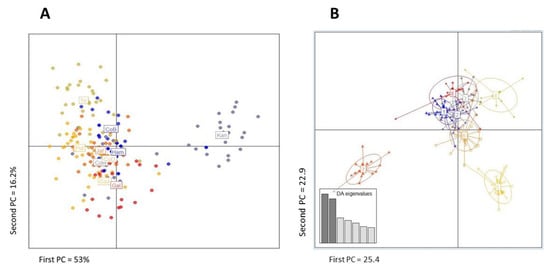 The population structure was analyzed by a principal component analysis (PCA) and discriminant analysis of principal components (DAPC) using adegenet 2.1.1 [] for R version 3.2.1 [,]. In DAPC analysis, the raw data is first transformed through a PCA and then a discriminant analysis (DA) is performed on the retained principal components (PCs). All individuals are assigned to the population for which they have the highest probability and any individual assigned to a population that is not their true population of origin are misclassified individuals. The find.clusters function was used to detect the number of clusters in the population with the use of k-means clustering. The lowest Bayesian Information Criterion (BIC) was used to infer the ideal value of K. The first two principal components of the DAPC were plotted to evaluate the relationship among clusters. A cross-validation function (Xval.dapc) was used to confirm the correct number of principal components (PC) to be retained.