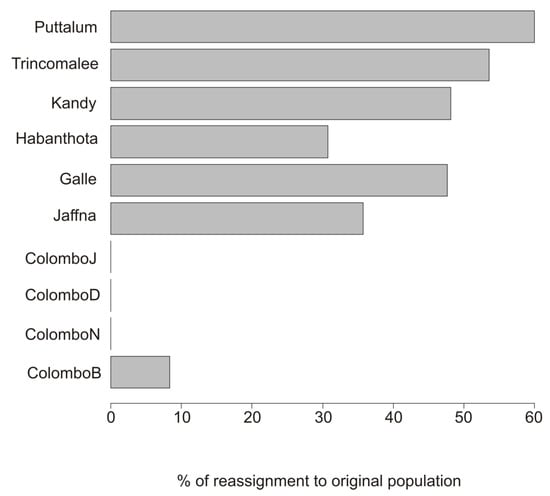 Misclassification of Ae. aegypti individuals in populations from Sri Lanka. Bars indicate the percentage of individuals that are reassigned to their original collection site.