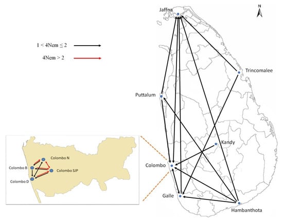 Location of Ae. aegypti collection sites in Sri Lanka and estimated patterns of gene flow among these sites. Blue dots indicate the sampling sites and light gray lines indicate the district boundaries on the map. The arrows in the diagram indicate the rate (4Nem) and direction of the gene flow among the collection sites as estimated by MIGRATE-n 3.5.1. A significant migration rate is indicated by a black arrow where 4Nem > 1. A red arrow indicates 4Nem > 2, which is highly significant, and 4Nem < 1 is not indicated as it does not imply sufficient migration between the donor and the recipient populations to offset genetic drift. The inset shows the gene flow between the collection sites in Colombo.
