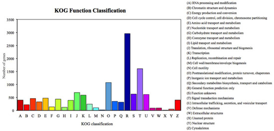 We annotated 39,395 of 120,267 unigenes via seven databases: NR (29,217) > GO (24,742) > PFAM (24,622) > SwissProt (17,521) > KOG (11,500) > KO (9,207) > NT (8,007). Among the most dominant functional classifications as explained by public database GO, were biological process designated as ‘cell process‘, ‘metabolic process‘ and ‘single organism process‘, followed by molecular function with terms ‘binding‘ and ‘catalytic activity‘, and cellular component with terms ‘cell‘ and ‘cell part‘ (Figure 1). In the category of biological process, a total of 12,826 genes were absolutely related with the metabolic process. On the other hand, the KOG functional classifications respectively explained ‘general function prediction only (R)’, ‘signal transduction mechanisms (T)’, ‘post-translational modification protein turnover chaperones (O)’ and ‘translation ribosomal structure and biogenesis (J)’ as the most dominated functions (Figure 2).
