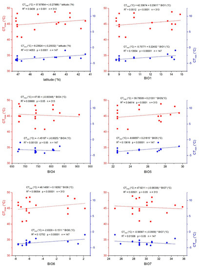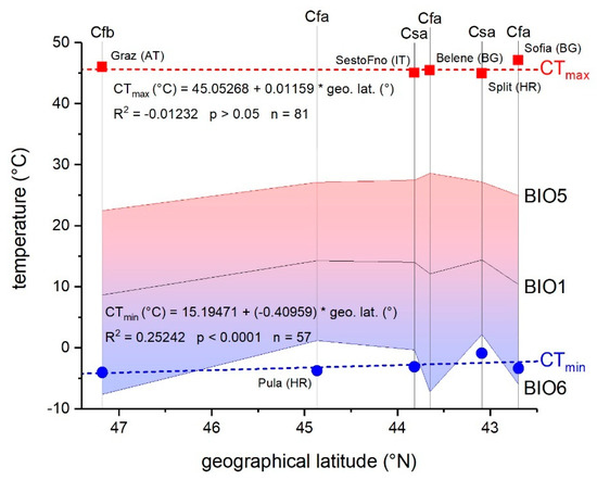 - Sunday, J.; Bennett, J.M.; Calosi, P.; Clusella-Trullas, S.; Gravel, S.; Hargreaves, A.L.; Leiva, F.P.; Verberk, W.C.E.P.; Olalla-Tárraga, M.Á.; Morales-Castilla, I. Thermal tolerance patterns across latitude and elevation. Philos. Trans. R. Soc. Lond. B Biol. Sci. 2019, 374, 20190036. [Google Scholar] [CrossRef] [PubMed]