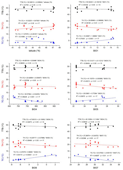 3.2. Correlation with Derived Physiological Thermal Tolerance Parameters (TTB, TC, TH)