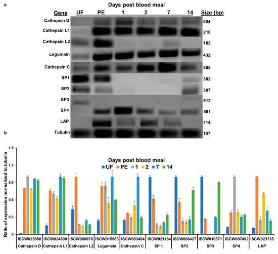 Transcripts of 10 proteases identified as the main proteolytic enzymes for hemoglobin degradation in I. scapularis [2] were examined in the adult female midgut. Out of these 10, four were serine proteases (ISCW021184, ISCW006427, ISCW010371, and ISCW007492), two were cathepsin L (ISCW024899 and ISCW000076), and one each were cathepsin C (ISCW03494), cathepsin D (ISCW023880), legumain (ISCW015983), and leucine aminopeptidase (ISCW023735). All sequences were confirmed by Sanger sequencing. Expression was determined at different time points: partially engorged adult females (collected 5 days post-host attachment but before rapid engorgement), and at 1, 2, 7, and 14 days PBM (fully engorged and actively digesting blood to provision developing eggs). Out of 10 genes tested, six were expressed in unfed samples whereas four genes [ISCW023880 (cathepsin D), ISCW024899 (cathepsin L), ISCW007492 (serine protease), and ISCW023735 (leucine aminopeptidase)] were only expressed during feeding or PBM (Figure 1a,b). Cathepsin D expression was highest at 1-day PBM and decreased afterward. One cathepsin L paralog (ISCW024899) expressed in all blood-fed stages tested, from partially engorged to 14 days PBM, and the other cathepsin L (ISCW000076) expressed in unfed and partially fed females with almost no expression in fully engorged females. Legumain was expressed at low levels in unfed females, then expression increased during and after feeding. Cathepsin C also expressed at low levels in unfed females and expression was higher during and after a blood meal; peak expression was at 2 and 7 days PBM and decreased at 14 days PBM. Serine proteases 1 and 2 (SP 1 and 2; ISCW021184 and ISCW006427) had a similar expression pattern in unfed and partially fed females and at 14 days PBM. Serine protease 3 (SP3; ISCW010371) had low expression in unfed and 14 days PBM samples. Serine protease 4 (SP4; ISCW007492) was not detected in unfed females, but expression was detected during and after blood-feeding with the highest expression at 1-day PBM. Leucine aminopeptidase expression was not detected in unfed females and peak expression was in partially engorged females. Expression decreased afterward and no expression was detected at 14 days PBM (Figure 1a,b).
