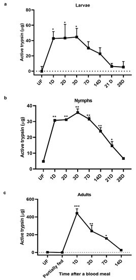 Trypsin activity increased significantly in larvae after a blood meal (Figure 2a). The peak trypsin activity period was 1–3 days PBM and levels decreased gradually afterward to nearly unfed levels at 21–28 days PBM (Figure 2a). In our colony, larvae begin molting into nymphs within 3–4 weeks; therefore, the 28-day time-point coincides with molting. In nymphs, a similar pattern was observed. Trypsin levels increased after a blood meal and were highest at 3 days PBM. Subsequently, levels decreased and by 28 days trypsin levels were similar to those in unfed nymphs (Figure 2b).