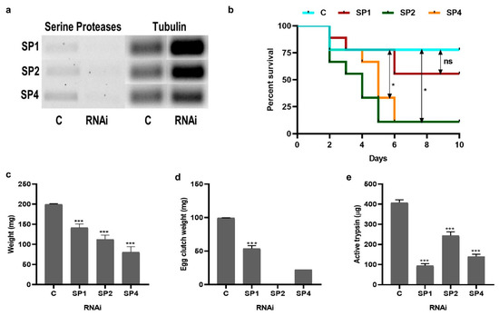 Effect of serine protease knockdown on adult female I. scapularis feeding, blood digestion, survival, and reproduction. (a) Representative RT-PCR of three I. scapularis serine proteases demonstrating knockdown. (b) Percent mortality during blood-feeding, until all ticks dropped off. (c) Wet weight of ticks measured immediately after dropping off the host. (d) Egg clutch weight, as determined after females stopped laying eggs for 2 consecutive days. (e) Active trypsin levels measured by the BApNA assay in midguts dissected from replete females, 1-day PBM. C: control ticks injected with water, RNAi: dsRNA injected ticks. SP: serine protease, SP1 = ISCW021184, SP2 = ISCW006427, and SP4 = ISCW007492. An unpaired t-test with Welch’s correction was used for comparing control and a treatment (SP1, SP2 and SP4) using Graphpad Prism v8. *** p < 0.0001.