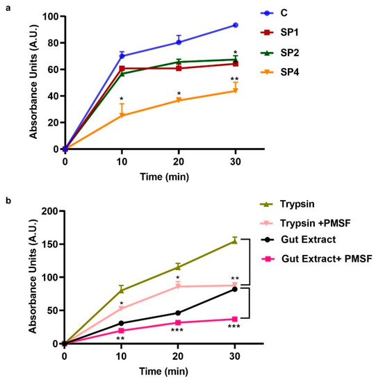 All experiments were replicated a minimum of three times with different biological cohorts. One-way ANOVA and Dunnett’s multiple comparisons were used for analysis of trypsin activity data. For the rest, a t-test with Welch’s correction was used in GraphPad (GraphPad Software, La Jolla, CA, USA). Mortality was recorded each day in control as well as three other genes of interest and then Kaplan–Meier survival analysis was performed using a Log-rank (Mantel–Cox) test to perform a pairwise comparison using control survival as reference.