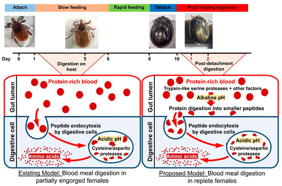 Ixodes scapularis is a three-host tick that requires a blood meal to complete each developmental stage, in addition to adult females needing blood for egg development [1]. The larvae and nymphs feed for 3–7 days whereas adult female feeding lasts for up to 10 days and consists of: (i) a slow feeding period up to 5–9 days post-attachment followed by (ii) rapid engorgement for 12–24 h before detachment from the host [2]. Rapid engorgement accounts for about two-thirds of the total blood meal. The tick midgut comprises a major portion of the body and consists of a ventriculus (stomach) and several pairs of highly branched ceca extending into all regions of the body. Blood digestion putatively starts in the midgut soon after ingestion and continues for several days to weeks after dropping off the host. Proteins represent about 95% of the non-water content of vertebrate blood. Consequently, hematophagous arthropods require proteases as the main enzymes in the midgut to process a blood meal [3].