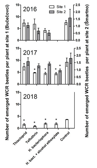 The number of western corn rootworm (WCR) beetles per plant that emerged and were caught on the yellow sticky trap in the 1-m2 emergence gauze cages, covering 12 plants, on both field sites in the three consecutive years (2016–2018) of field experimentation. Graphs show average and standard errors (n = 25 for all treatments, except 15 for H. bact. + alcohol ethoxylate). Asterisks indicate significant differences from the respective controls (p < 0.05). H. bact.—H. bacteriophora.
