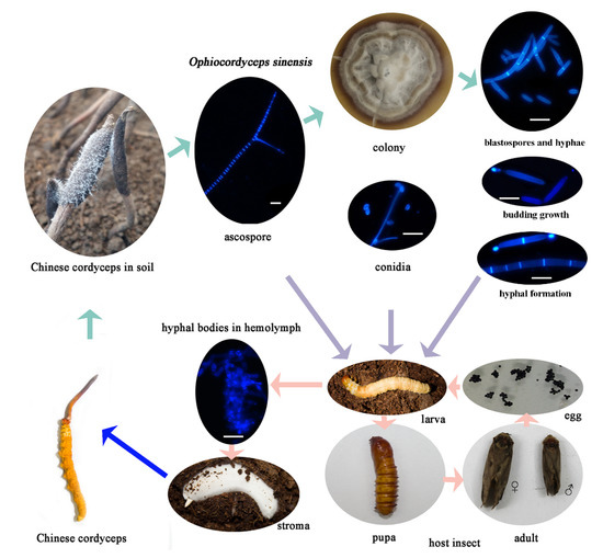 - Li, X.; Liu, Q.; Li, W.; Li, Q.; Qian, Z.; Liu, X.; Dong, C. A breakthrough in the artificial cultivation of Chinese cordyceps on a large-scale and its impact on science, the economy, and industry. Crit. Rev. Biotechnol. 2019, 39, 181–191. [Google Scholar] [CrossRef]