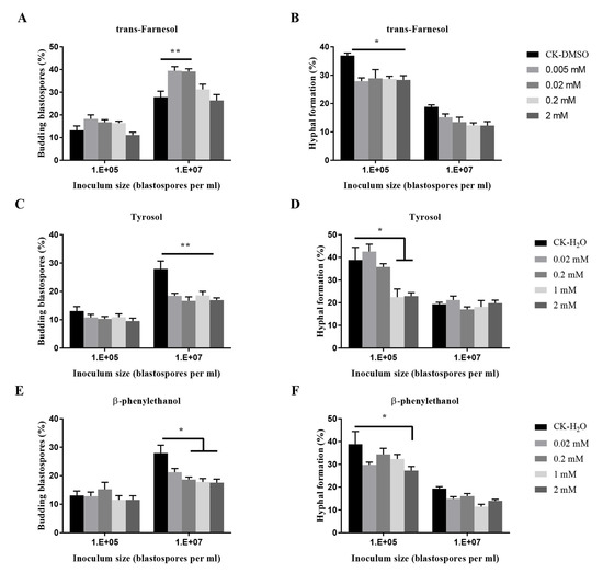 - Chen, H.; Fink, G.R. Feedback control of morphogenesis in fungi by aromatic alcohols. Genes Dev. 2006, 20, 1150–1161. [Google Scholar] [CrossRef] [PubMed]