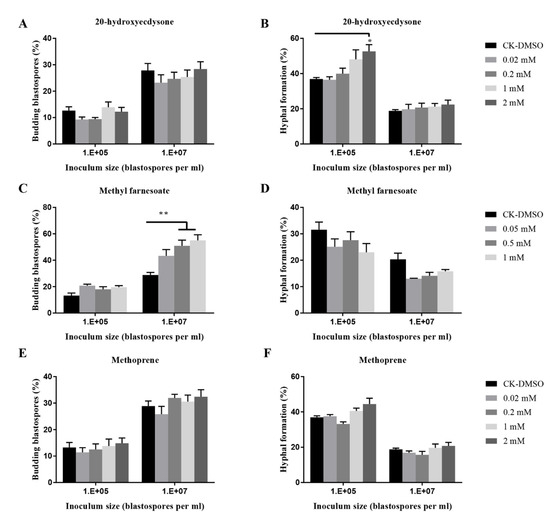 - Harshman, L.G.; Song, K.D.; Casas, J.; Schuurmans, A.; Kuwano, E.; Kachman, S.D.; Riddiford, L.M.; Hammock, B.D. Bioassays of compounds with potential juvenoid activity on Drosophila melanogaster: Juvenile hormone III, bisepoxide juvenile hormone III and methyl farnesoates. J. Insect Physiol. 2010, 56, 1465–1470. [Google Scholar] [CrossRef][Green Version]