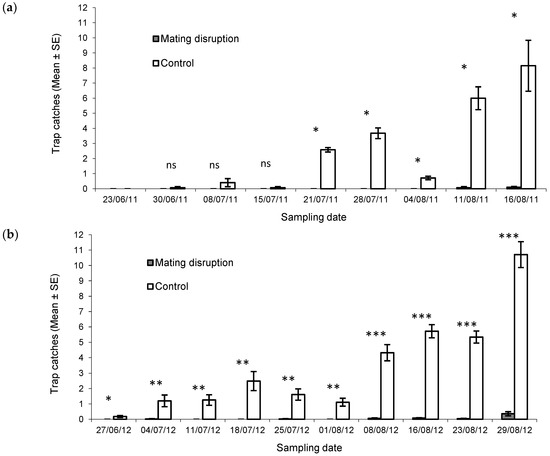 Mean number of Helicoverpa armigera males trapped per night in pheromone-treated (mating disruption) and pheromone-untreated (control) areas in 2011 (a) and 2012 (b). Bars represent the standard errors of the means. Male catches were compared using the Mann–Whitney U test: ns = not significant; * p < 0.05; ** p < 0.01; *** p < 0.001.