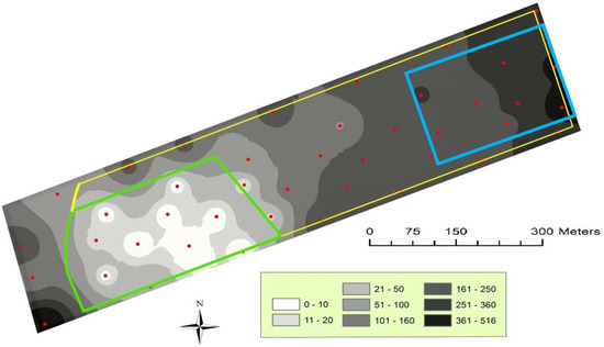 The validation analysis of IDW maps is reported in Table 3 including the correlation analysis of the predicted vs. observed values and the calculation of the mean prediction errors. Eleven out of 12 of the contour maps were statistically supported by cross-validation analysis. In Figure 2 and Figure 3, the IDW maps of H. armigera male distribution, calculated from the total catch per trap during the sampling period, are shown. Only the maps of the total catch per year are reported, because they properly describe the spatial pattern of the catches during both full field seasons. In each year, the male catch within the pheromone-treated area can be visualized and compared with those of the remaining part of the pheromone-untreated field. The gaps of catches within the treated areas in the maps can be considered as a demonstration of the effectiveness of the male capture reduction due to mating disruption (Figure 2 and Figure 3). The catch patches, visualized as the darker filled contours, indicate the areas of the fields where male disruption was less or not effective. These areas of reduced efficacy correspond to the hedges and to the east zone of the mating disruption area, which is adjacent to the pheromone-untreated tomato. Moreover, the catch patches reached the highest values in the northeast area of the maps (up to 150 and 350 male captures in the 2011 and 2012 maps, respectively), corresponding to the pheromone untreated (control) area.