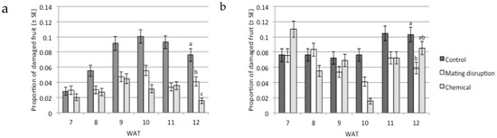 Proportion of damaged fruit (±binomial SE) for the treatments in the 2011 (a) and 2012 (b) seasons at each sampling date. WAT = weeks after transplanting. WAT 12 corresponded to the last sampling, one day before harvest. Bars bearing different letters are significantly different for p < 0.05 (χ2 test followed by the z-test).