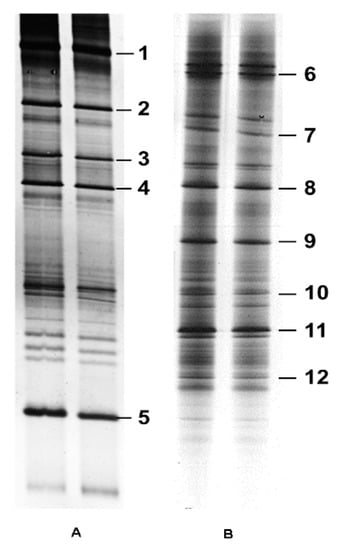 - Liang, H.W.; Wang, C.Z.; Li, Z.; Luo, X.; Zou, G. Improvement of the silver-stained technique of polyacrylamide gel electrophoresis. Hereditas 2008, 30, 1379–1382. [Google Scholar] [CrossRef] [PubMed]