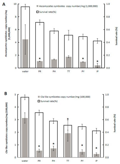 Effect of fungicides on the abundance of Ascomycetes symbiotes (A) and Cla-like symbiotes (B), and on survival rate of female adult WBPH. The abundance of Ascomycetes symbiotes and Cla-like symbiotes was determined by qPCR. On the X-axis PR, 70% propineb wettable powder (WP); PH, 70% propamocarb hydrochloride aqueous solution (AS); TT, 25% trifloxystrobin and 50% tebuconazole water-dispersible granules (WG); PY, 40% pyrimethanil suspension concentrate (SC); IP, 50% iprodione SC; The asterisks represents the significant differences (<0.01) which was tested by Tukey’s method.