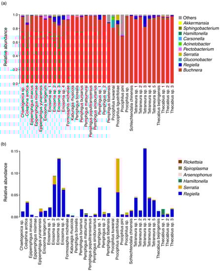 Bar plots of all bacteria (a) and facultative symbionts (b) associated with Eriosomatinae.