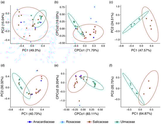 PCoA plot illustrating the separation of all samples from four host plant groups (a and d) and species distributing in the same location from two host plant groups (c and f) based on differences in bacterial community structure (a and c) and facultative symbiont community structure (d and f); CPCoA plot illustrating the separation of samples from four host plant groups based on differences in bacterial community structure (20.0% of the total variance and p = 0.003) (b) and facultative symbiont community structure (21.5% of the total variance and p = 0.001) (e). Colours correspond to different plant families, as shown in the legend. Ellipses cover 95% of the data for each plant families.