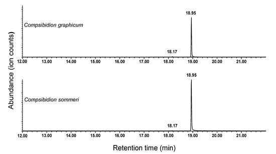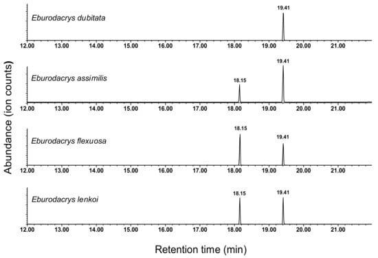 Volatiles were eluted from collectors with three 500-μL aliquots of methylene chloride, into silanized amber glass vials. Each extract was then concentrated to ~500 μL under a gentle flow of N2 and stored at −30 °C until analysis. Overall, aeration extracts were obtained in the following numbers (males/females) from each species: E. assimilis (6/2); E. dubitata (16/9); E. flexuosa (8/4); E. lenkoi (12/5); C. graphicum (8/4); and C. sommeri (11/3). Sex-specific volatile compounds were detected in ~50% of aeration samples from males, but were not detected in any extracts from females.