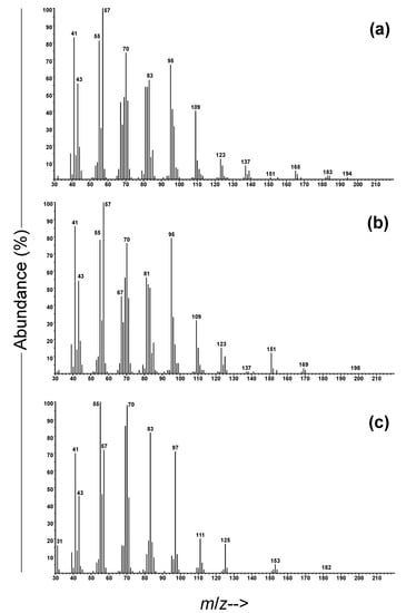 Extracts of volatiles were initially analyzed in Brazil by gas chromatography with flame ionization detection (GC-FID), or by gas chromatography-mass spectrometry (GC-MS), to confirm the presence of sex-specific compounds. One microliter of extract was injected into a GC-2010 gas chromatograph (Shimadzu Corp., Kyoto, Japan), fitted with an HP5-MS capillary column (30 m × 0.25 mm i.d. × 0.25 µm film; Agilent Technologies, Santa Clara, CA, USA). Injections were made in splitless mode (purge valve off for 1 min), with an injector temperature of 250 °C and helium carrier gas at a linear velocity of 25 cm/s. In the same fashion, injections were made in a Shimadzu QP2010 Ultra GCMS (Shimadzu Corp., Kyoto, Japan), fitted with a nonpolar column (30 m × 0.25 mm × 25 µm film; Rxi-1MS; Restek, Bellefonte, PA, USA). Ion source and quadrupole temperatures were set at 250 °C. Mass spectra were recorded in electron impact mode (70 eV) from m/z 35–280. The GC oven was programmed from 35 °C for 1 min, increased to 40 °C at 2 °C/min, hold 1 min, and increased to 250 °C at 10 °C/min, hold 10 min. Representative extracts that contained detectable amounts of sex-specific compounds were sent to the University of California, Riverside (UCR), for identification of the sex-specific compounds. At UCR, extracts were reanalyzed with an Agilent 7820A GC, coupled to a 5977E mass selective detector. The GC was equipped with an HP-5 column (same dimensions as above), and samples were injected in splitless mode. Helium carrier gas was used, with an oven temperature program of 40 °C/5 min, 10 °C/min to 280 °C (hold 10 min). The injector, ion source, and quadrupole temperatures were 250, 230, and 150 °C respectively. Mass spectra were obtained with electron impact ionization (70 eV), scanning a mass range from 40–400 amu. Retention indices were calculated by comparison with a blend of straight-chain alkane standards.