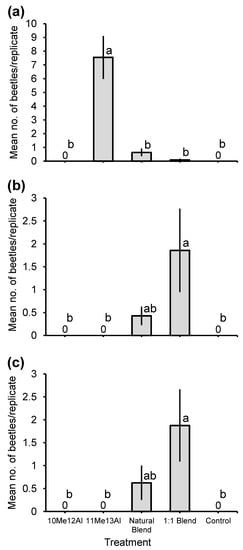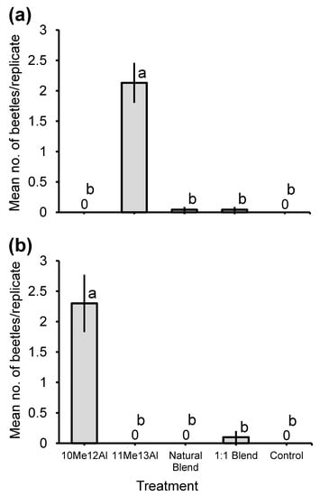 E. dubitata (i.e., 11-methyltridecanal) in Valentim Gentil, from 5 December 2016 to 8 January 2017. We used cross-vane panel traps as described above, except that the collection jars were modified to hold 300 mL of an aqueous solution of dish soap and NaCl to kill and preserve the captured beetles. The lures (press-seal sachets with a cotton dental roll) were loaded with 50 mg of racemic 11-methyltridecanal, diluted in 950 µL of isopropanol. Control lures contained 1 mL of neat isopropanol. Traps were spaced ~15 m apart in four pairs (blocks), which were ~30 m apart. Previous studies have demonstrated that this is an ample distance between traps to prevent interference between treatments within a trap transect [