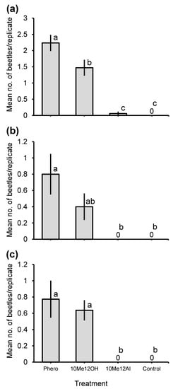 After the identification of male-specific volatiles from C. sommeri and C. graphicum, we followed up with bioassays testing 10-methyldodecanal and 10-methyldodecanol, individually and in blends. The treatment lures were: 1) a blend of 10-methyldodecanal (2.5 mg) and 10-methyldodecanol (50 mg), similar to the ratios produced by the beetles; 2) 10-methyldodecanol (50 mg); 3) 10-methyldodecanal (2.5 mg); and 4) control (1 mL of isopropanol). Treatments were assigned randomly to traps within six blocks, and each block contained representatives of all treatments. Traps were hung from tree branches at ~3 m from the ground and spaced 20 m apart, and blocks were 40 m from each other. Trap catches were tallied every 2–3 d from 12 November to 28 December 2019, following the same procedures used in the other bioassays.