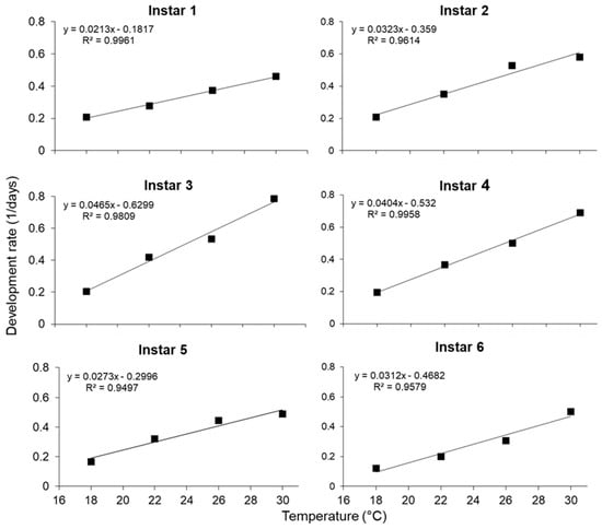 | Sixth instar | y = 0.0307x − 0.4560 | 32.57 ± 0.94 | 14.85 ± 0.24 | 0.92 |