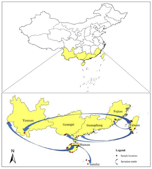 With a comprehensive analysis of genetic structure, PCA, FST, and the phylogenetic tree, we could indicate the invasion pathway. These results indicated two potential independent populations formed in Taiwan and Hainan, which then invaded mainland China by two independent pathways (Figure 1).