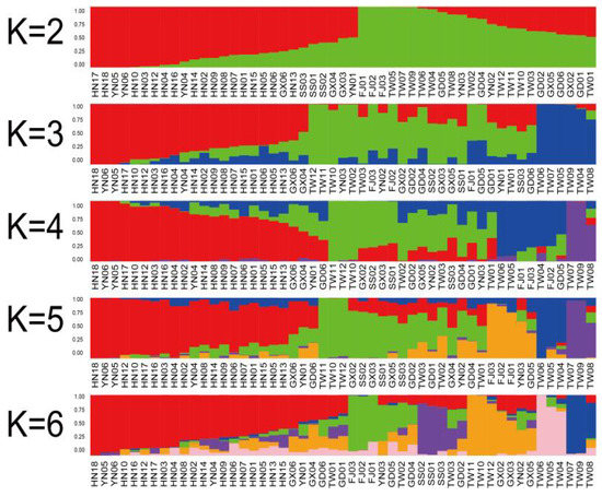 After the stringent filtering procedure, 10,127 loci were identified as candidate SNPs. The candidate SNPs were used for subsequent population inference. The STRUCTURE analysis software was used to analyze the population structure of B. longissima (Figure 2). Population structure analysis for each K value was performed, as well as K analysis for a different number of clusters (K) for 51 B. longissima accessions. K showed a peak at 4, suggesting four clusters as the optimal option (Figure 3). At K = 2, all accessions are divided into Hainan population and non-Hainan population. From K = 3 to K = 6, the Hainan population remains stable, only the Sansha population is differentiated, and non-Hainan populations have gradually differentiated into smaller subpopulations. With the optimal K = 4, all of the accessions are divided into 4 populations. Population 1 is the Hainan population. Population 2 is the Mainland of Southern China population, including Guangdong, Guangxi, and Yunnan. Population 3 is the Taiwan Strait population, including Fujian and Taiwan. Population 4 is the Taiwan Taichung population, indicating the population differentiation with B. longissima accessions collected in Taiwan.