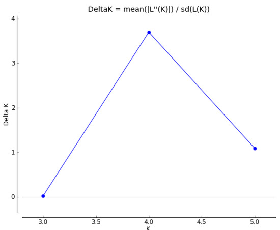 Based on the candidate SNPs, we inferred the population structure of B. longissima using Structure 2.3.4 [24,25,26,27]. The statistic βKβ, which indicates the change in likelihood of different numbers of clusters, was calculated, and the cluster number with the highest K value, which indicated the most likely number of clusters in the population, was obtained by using Structure Harvester (available at http://taylor0.biology.ucla.edu/structureHarvester/). Based on the K value that we have selected, pairwise FST values were estimated in Arlequin v.3.5 [28,29].